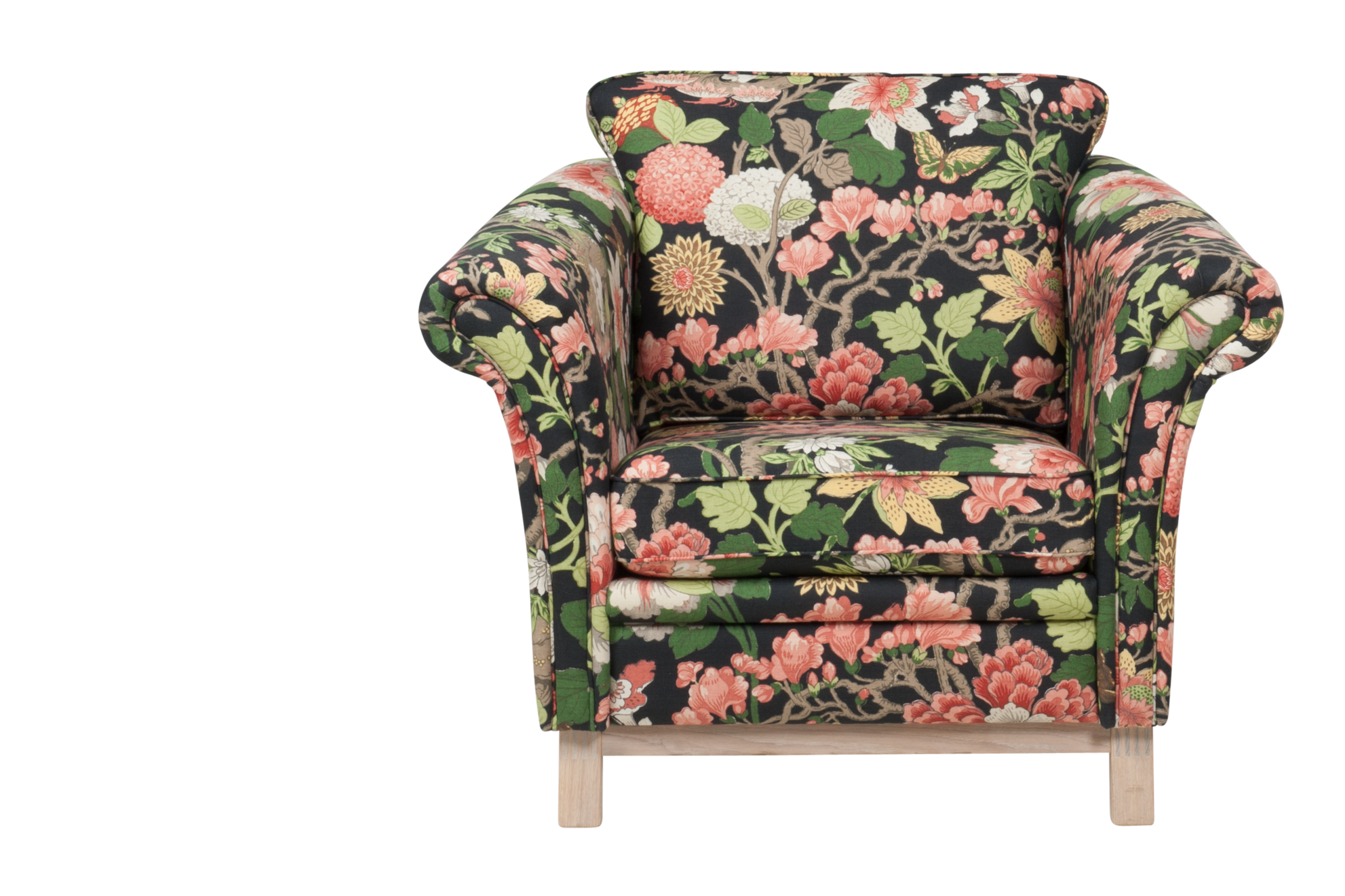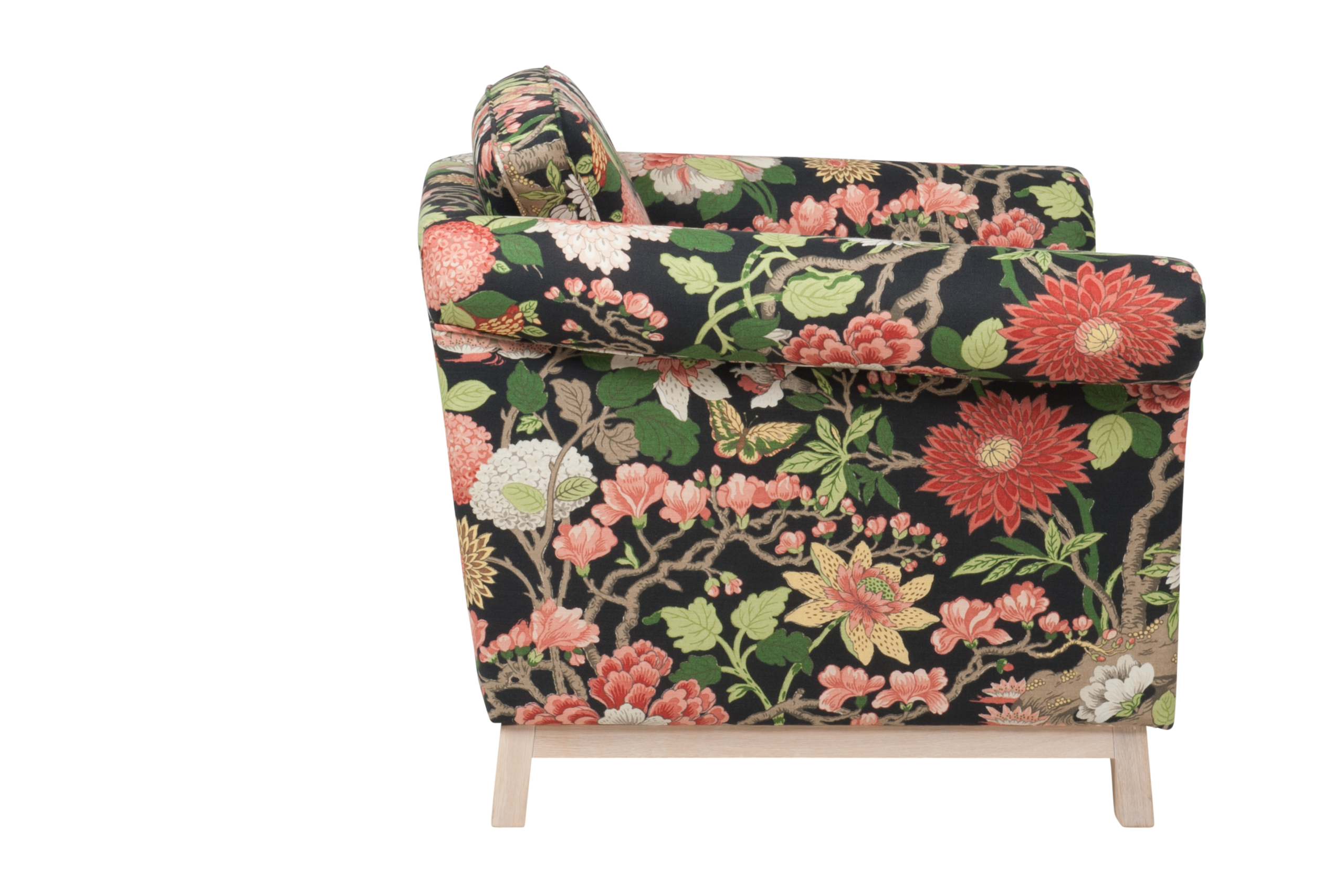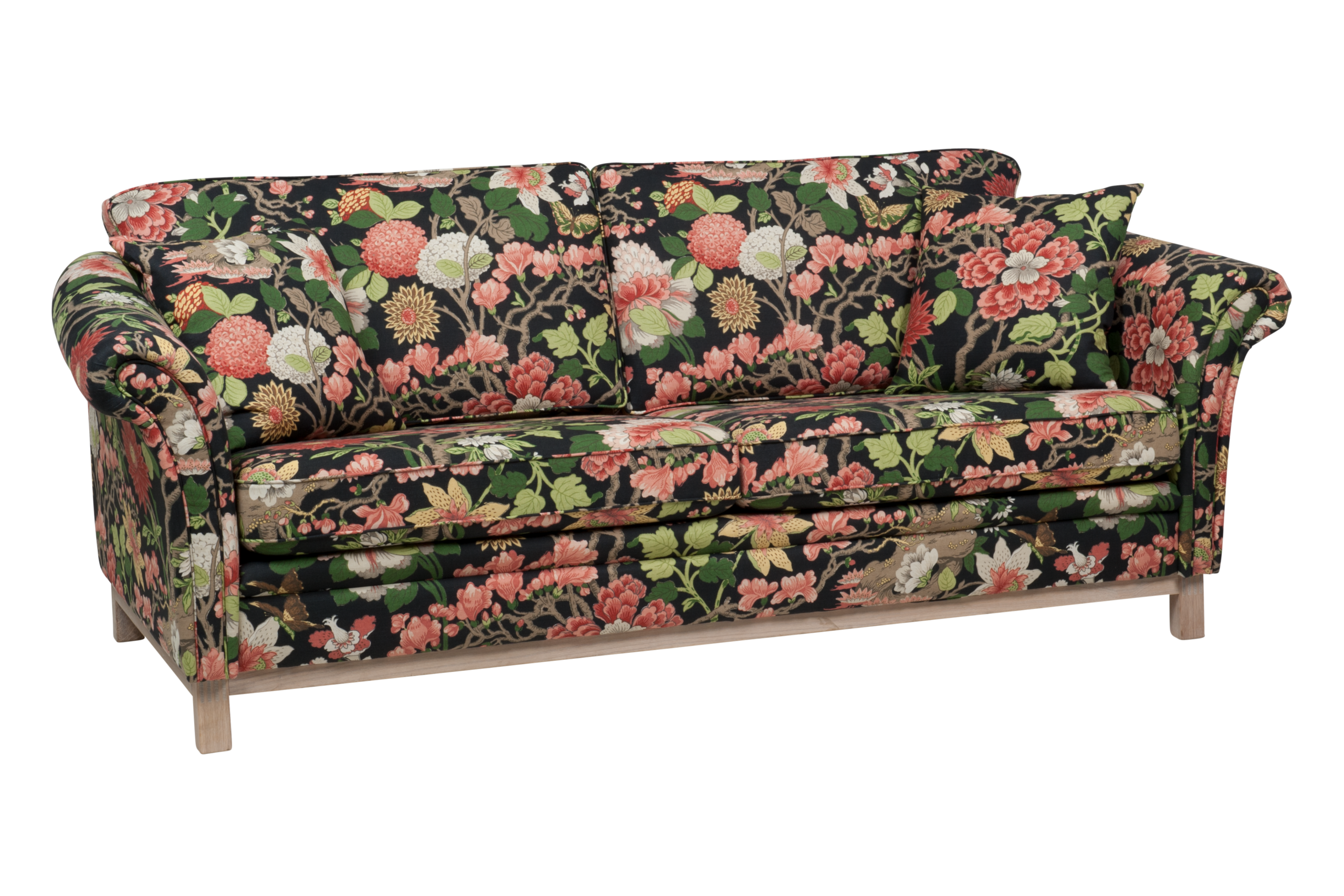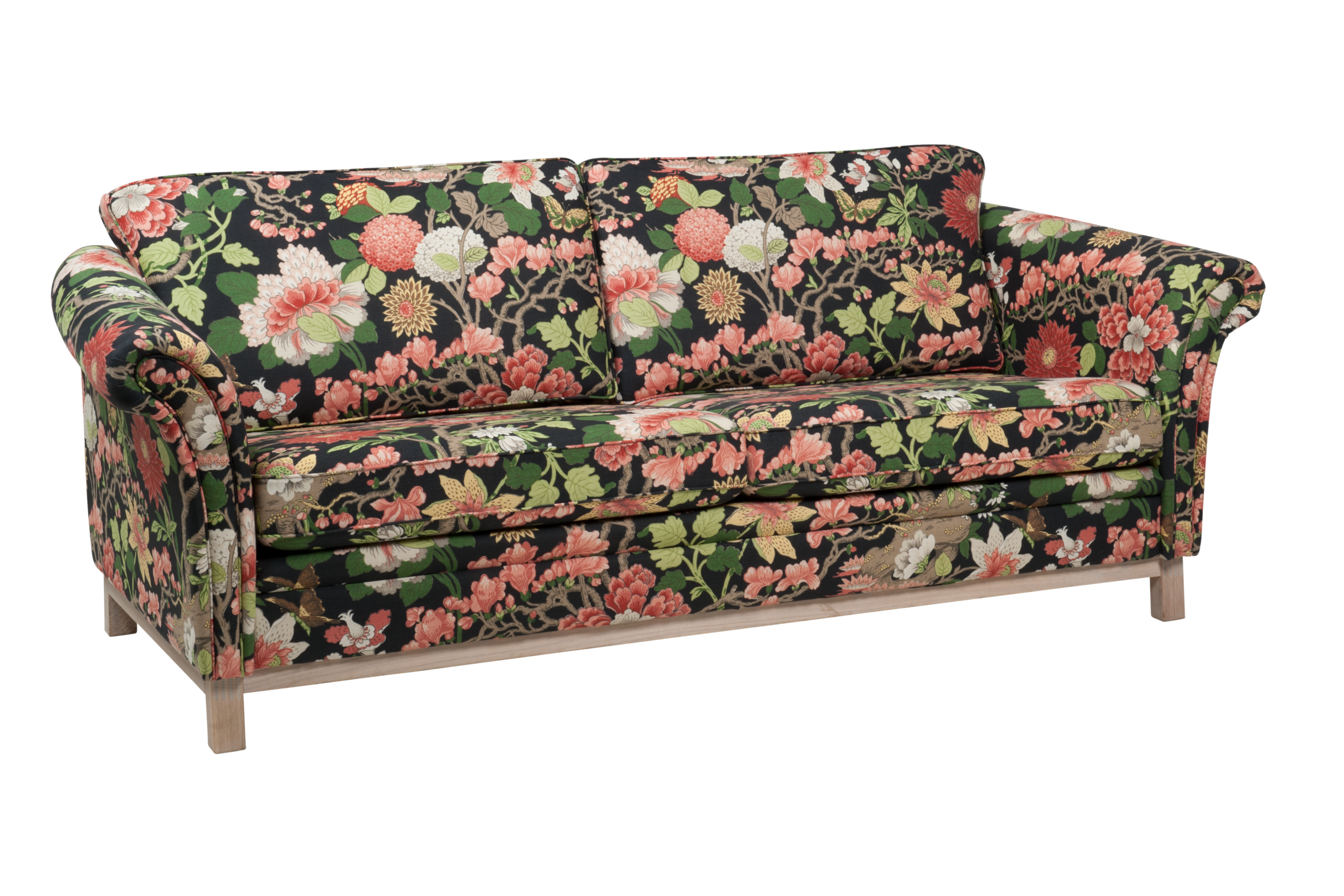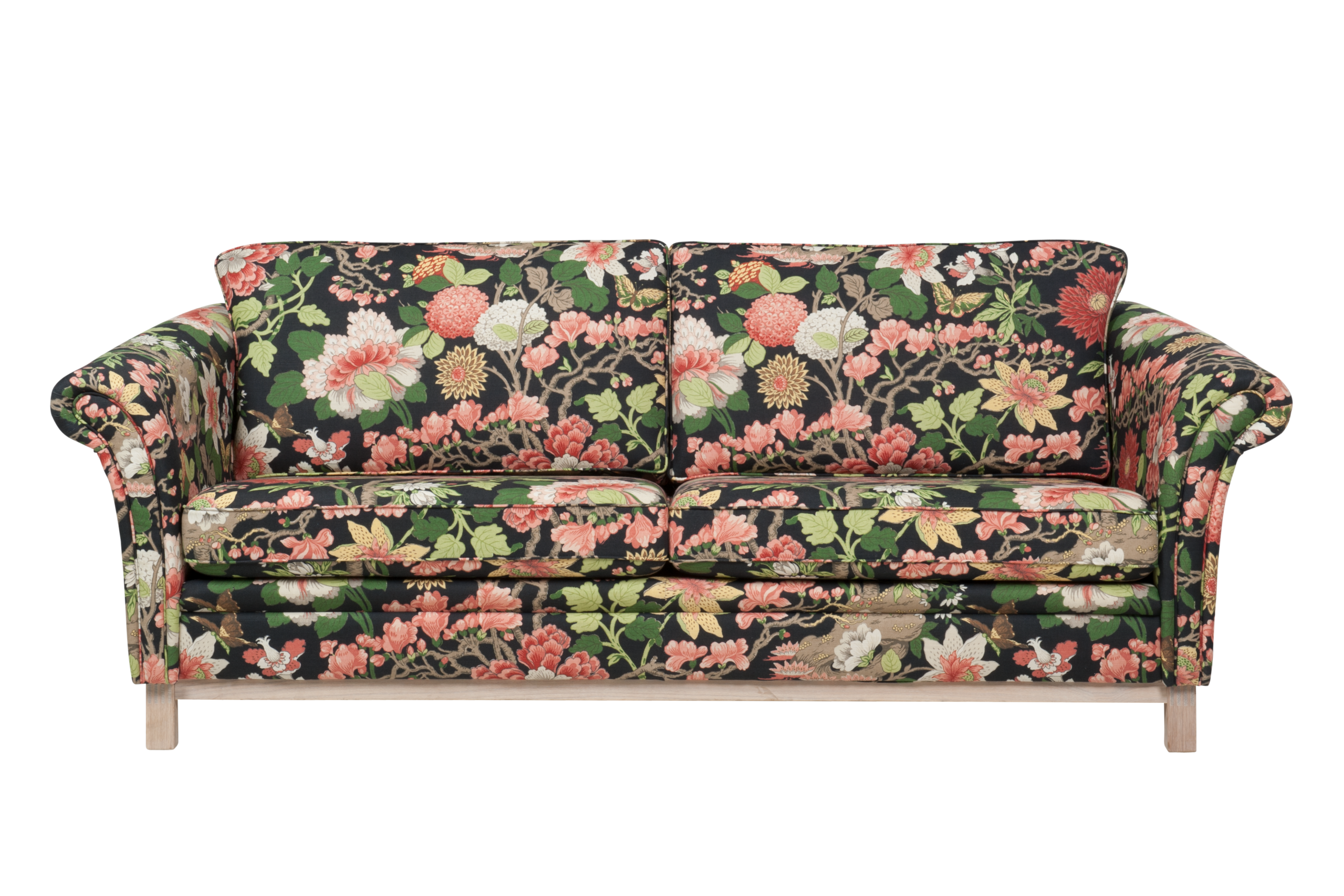 Lättplacerad och nätt förgyller Falsterbo sin omgivning. Exklusiv sockel i massiv ek är standard. Här uppklädd i ett ljuvligt blommande tyg. Finns i såväl mjukare som fastare komfort alternativ.