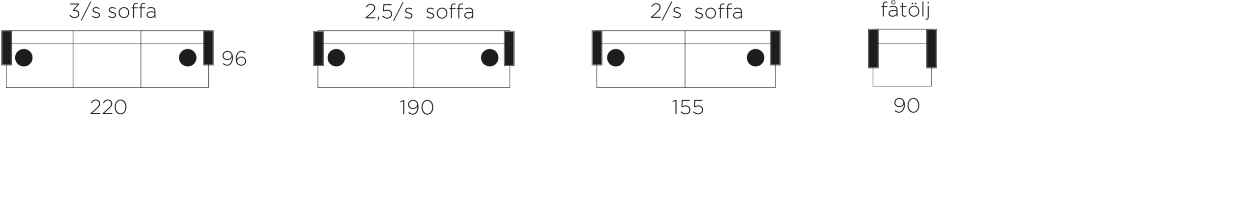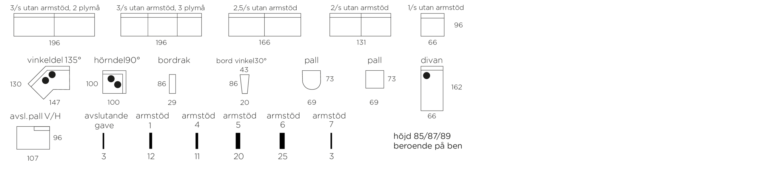 V/H = vänster och högeralternativ ⦁ = prydnadskuddar ingår enl. standard
